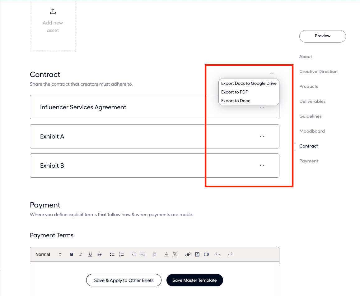 - To export all parts of the contract at once, use the ellipses on the top right of the contract section